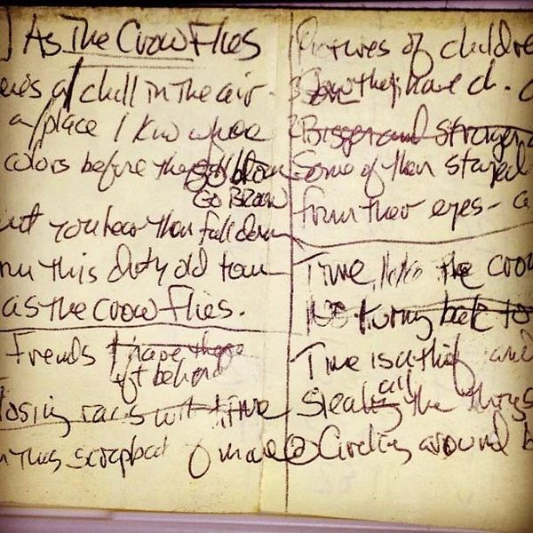 The original lyrics to As The Crow Flies, written on two Post-It Notes