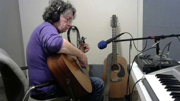 Dave records guitar tracks for Right Here in his home studio, 2017